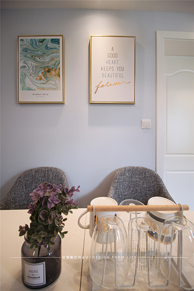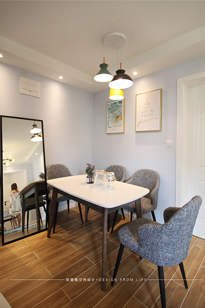 餐廳遵從整體基調(diào)以原木色為主,延伸客廳的裝修搭配,即方便使用,又讓空間顯得相得益彰。加上黑色的藝術(shù)吊燈,點(diǎn)綴了整個(gè)空間的浪漫色調(diào)。