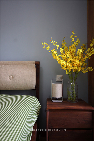 臥室以藍(lán)灰色調(diào)為主,營(yíng)造大氣莊重的空間格調(diào),舒適的棉麻床品搭配同色系的靠包保證優(yōu)質(zhì)睡眠的同時(shí),也為空間增添了許多味道。