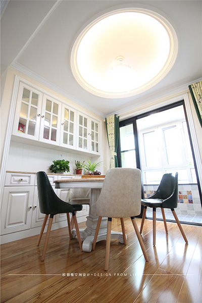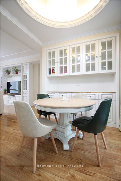 餐廳與客廳的空間應(yīng)用全通透,既滿足了使用功能又增添了空間視線互通。在燈具的選擇上也注重冷暖搭配,色彩呼應(yīng),經(jīng)典的家具搭配獨(dú)特的配飾 宛如藝術(shù)心靈的沖撞。業(yè)主非常享受在餐桌上辦公,用他的話說“陽光很暖、氛圍很好”。