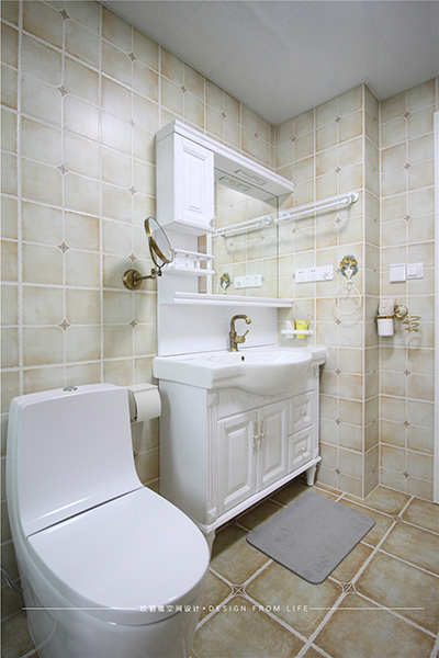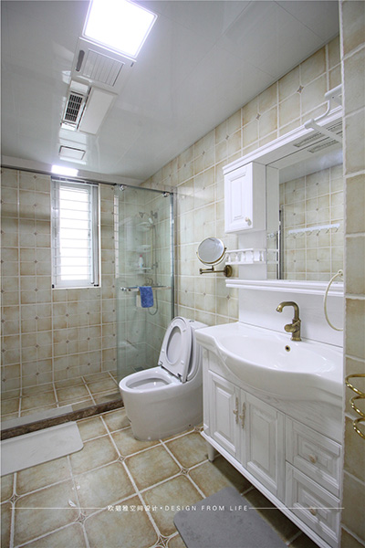 衛(wèi)生間的設(shè)計(jì)、干濕分離、因?yàn)槭亲背系姆孔樱晒馀c通風(fēng)兼具,洗浴門用玻璃隔斷,簡(jiǎn)約通透、現(xiàn)代感十足,洗手臺(tái)銅鏡的搭配,別致新穎,打造溫馨浪漫的小資情調(diào)。