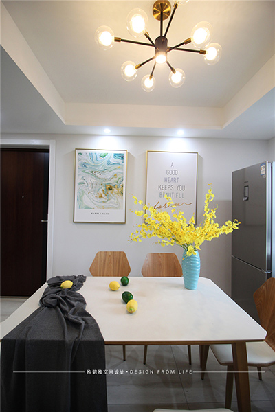客廳整體以淺灰色系為基調(diào),使空間的搭配柔和而恬靜,適合于浪漫溫馨的新婚小夫妻,也與他們簡單的生活方式所匹配。小清新文藝掛畫和簡約創(chuàng)意吊燈,散發(fā)著濃濃的北歐格調(diào)。