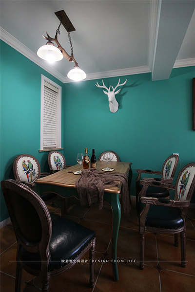 本案的設(shè)計(jì)營造浪漫、自由、高雅的古典風(fēng)格,給人帶來自然舒適、悠然輕松的生活情趣。墻壁上的鹿角和吊燈搭配著古典的美式家具,豐富了空間的視覺效果,呈現(xiàn)出了美式的自由豪爽。