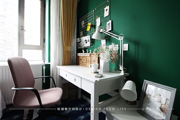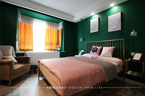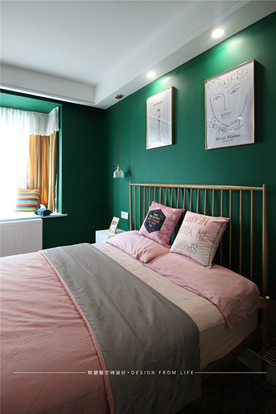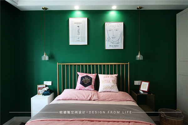臥室粉色和墨綠色的裝扮,理性而又靜謐,比極簡(jiǎn)多了一份溫度,比美式多了一份質(zhì)樸。