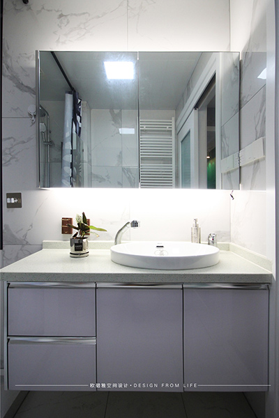 衛(wèi)生間淺灰色的瓷磚和圓形的臺(tái)盆柜,沉靜的色彩,自然的材料,讓整個(gè)空間顯得極具質(zhì)感。